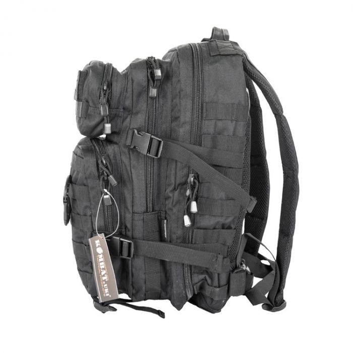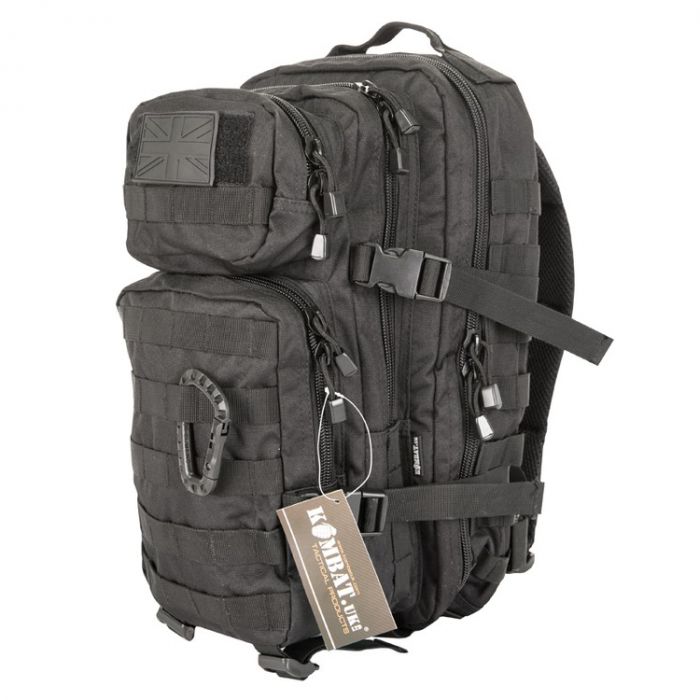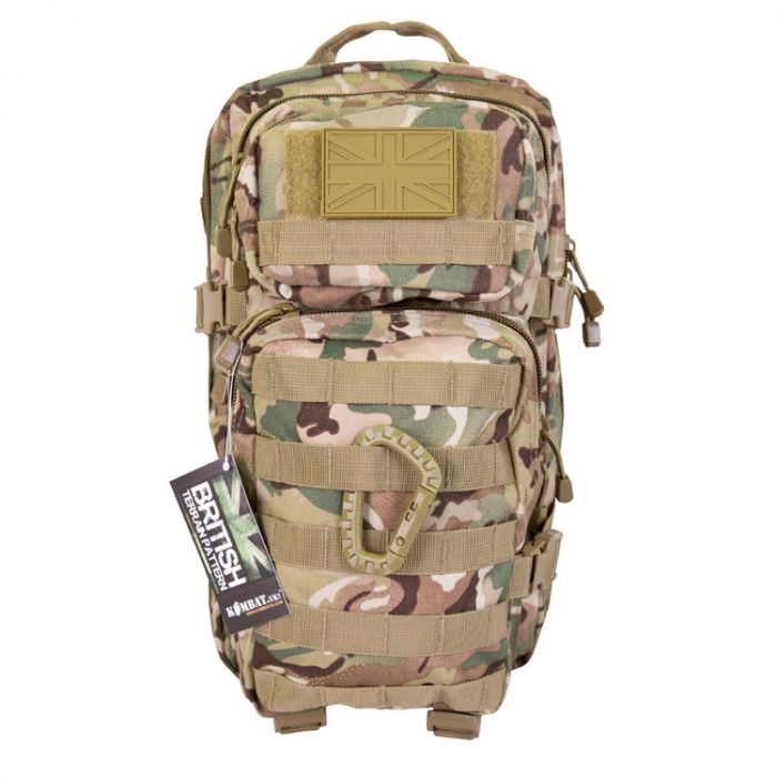 Small 28 Litre Assault Pack from Kombat UK. Available in both black and the new BTP British Terrain Pattern camouflage colours, it is made from 1000 denier DPM Waterproof Cordura with molle tabs and compartments all over. The small assault pack also features an adjustable waist strap and separate compartment for aqua bladder.